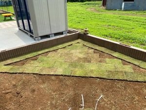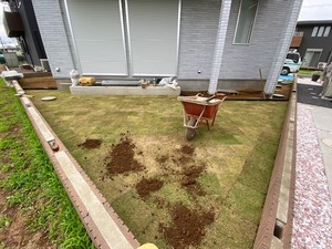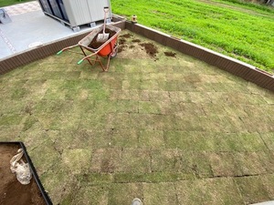 本日は、土浦市K様邸にて外構工事の芝貼りを