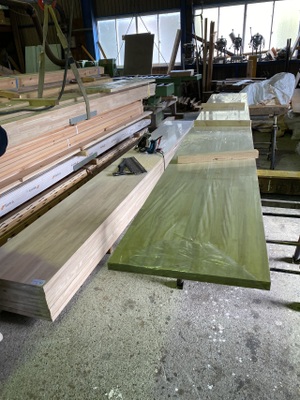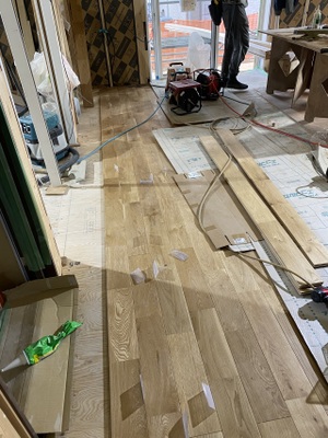 その後、つくば市S様邸にて新築工事の1階フローリング貼りを