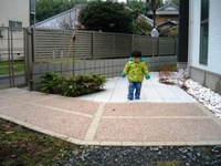 アプローチ部分の白いタイルも樹脂の塗床も◎