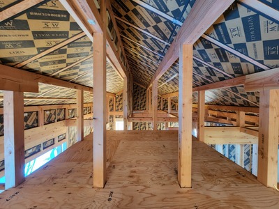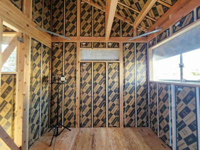 2階の壁の黒い部分は外壁ではなく透湿防水シート(ウルト製品:ウートップハイムシールド)です。