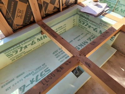 屋根や壁が塞がって、雨が降っても室内に雨が入らなくなってから基礎断熱材と床合板は施工します。