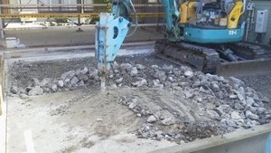 バックホウの先にコンクリートを砕くアームを装着して土間を解体中です。