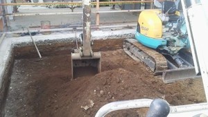 現在コンクリートの打ってある地盤面を下げて駐車スペースを拡張するために、