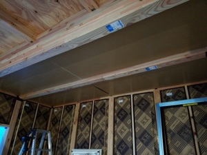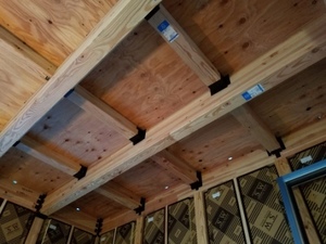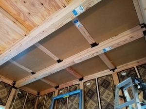 今回の施工例では、1階の床合板施工後にボード間の隙間に気密テープを貼り、梁とボードの取り合い部にシールを施すことで、隙間からの空気の出入りを抑制し、高い気密性を確保しています。