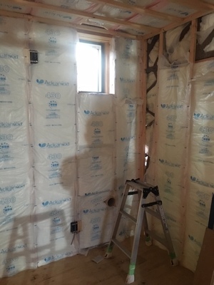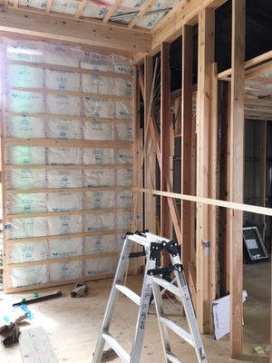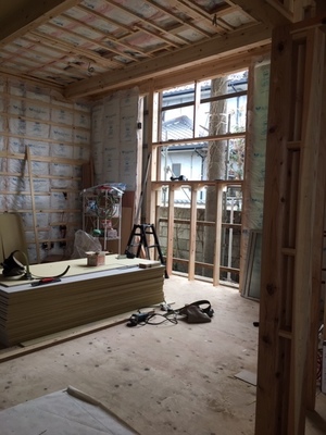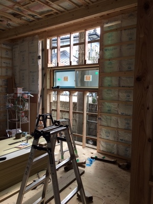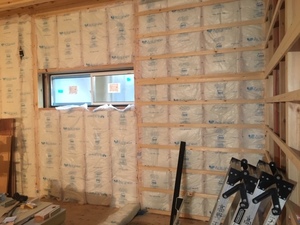 内壁胴縁作製、壁断熱材入れ、サッシ取り付けを