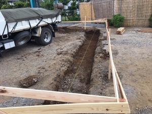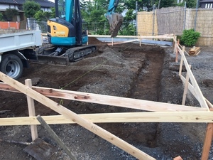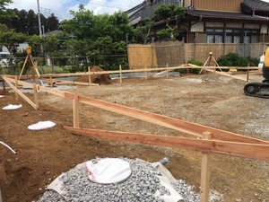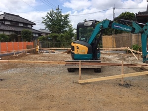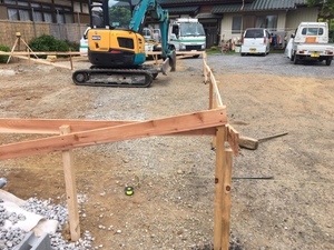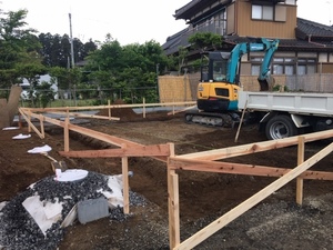 基礎工事の、丁張り、掘削を施工致しました。