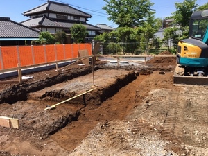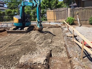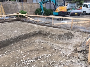 新築工事、基礎工事の掘削、砕石ひきならしを