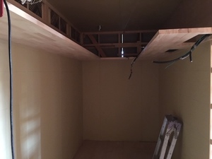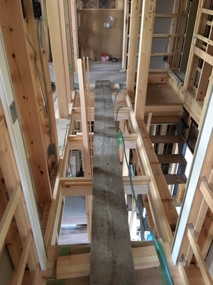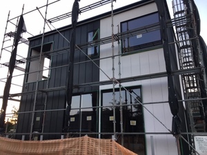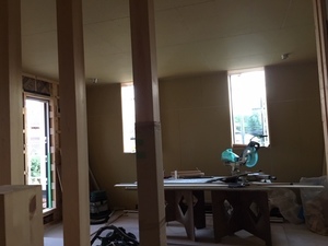 新築工事の外壁材貼り、室内二階ファミリークローゼット棚