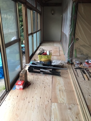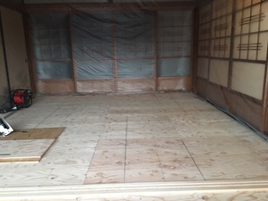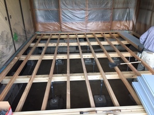 鋼製束取り付け、床下断熱材設置、床合板貼りを
