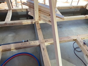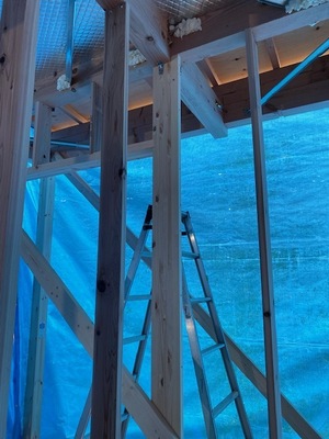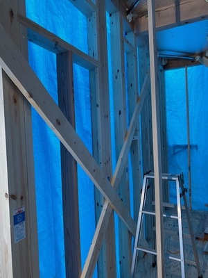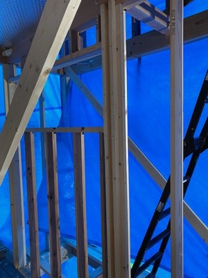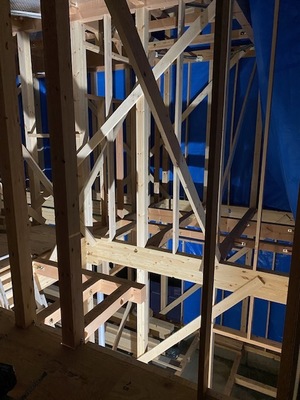 大工工事にて、入隅下地作成、間柱取り付け施工を