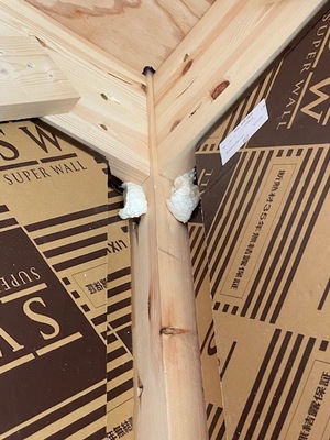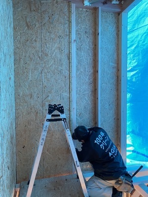細かい金物部にも、気密処理。ウレタン吹付け施工していきます。