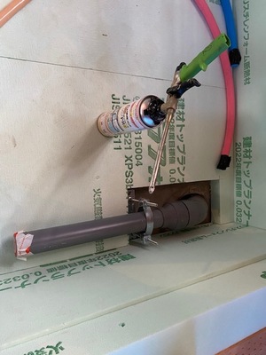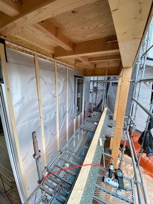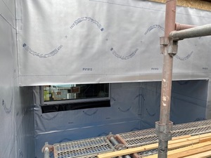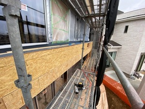 OSB合板貼り、遮熱シート貼り、外壁下地胴縁取り付けを