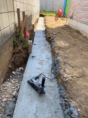 本日は、土浦市K様邸にて外構工事の鉄筋穴あけ、差し込みを