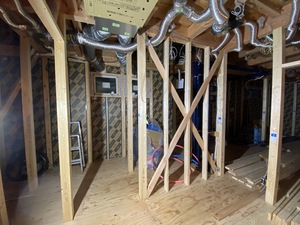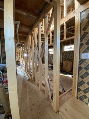 S様邸の新築工事では、1階の階段付近、トイレ、洗面器付近に筋交いを設置し、建物の強度を高める作業を行いました。