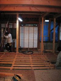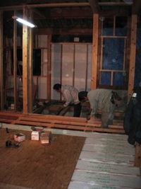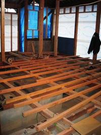 M様邸では、構造体補強後、大引、根太を施工し、その間に断熱材を敷き詰めました。