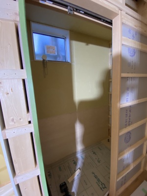 1階トイレラワン合板貼りをおこないました。