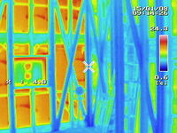 サッシの部分は低温です。ガラスの中心が赤いのは、外部足場が写ってしまったためです。