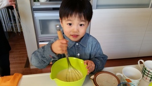 ちゃーんとホットケーキの素を混ぜられるようになってました