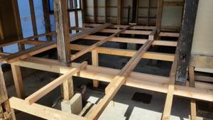 写真左:床組み中。昔の造りは床下空間がとても高く確保されていて