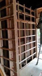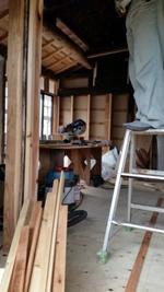 写真右:壁の不陸を胴縁と間柱で調整してます。