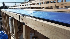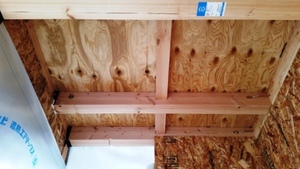 天井に断熱材を取り付ける前にも【合板と梁】の隙間を【気密テープ】で処理します。