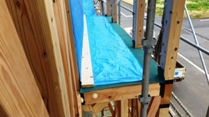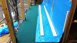↓天気が崩れるという予報なのでベランダ部分に屋根の下地に使うルーフィングを貼って養生してきました。