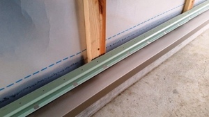 その次に土台水切りの上部にロングスターターという緑色の部材の取付です。